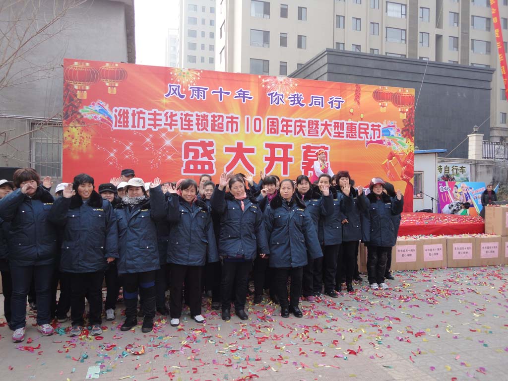 嚴(yán)冬送溫暖,關(guān)愛送報員。11月23日,在十周年慶暨大型惠民節(jié)開幕儀式上,豐華連鎖超市再次獻(xiàn)愛心,向奔波在市區(qū)的濰坊報業(yè)集團(tuán)165位報紙投遞員,贈送御寒棉衣,表達(dá)真摯的問候。