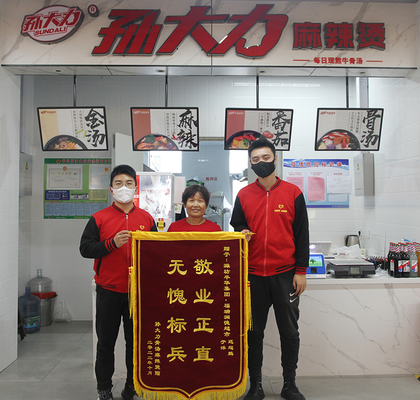 一心一意做服務(wù),細(xì)節(jié)之中見初心。10月27日,二樓商戶孫大力骨湯麻辣燙老板手指受傷無法到店,僅剩兩位老人在店經(jīng)營,因年紀(jì)大不會使用收銀系統(tǒng),無法收款。于洋和遲超鵬得知該情況后主動擔(dān)當(dāng)每天中午幫商戶收款,使其能夠正常經(jīng)營。11月2日,二樓商戶孫大力骨湯麻辣燙為Free Land送來了錦旗。一是對此事表示感謝,二是對Free Land主動幫助商戶送餐、充電充水、有問題及時對接解決等日常服務(wù)工作表示肯定。截至發(fā)稿日期,F(xiàn)ree Land仍在堅(jiān)持每日中午幫助該業(yè)戶收款,真正將全心全意服務(wù)的宗旨和初心做到了實(shí)處。