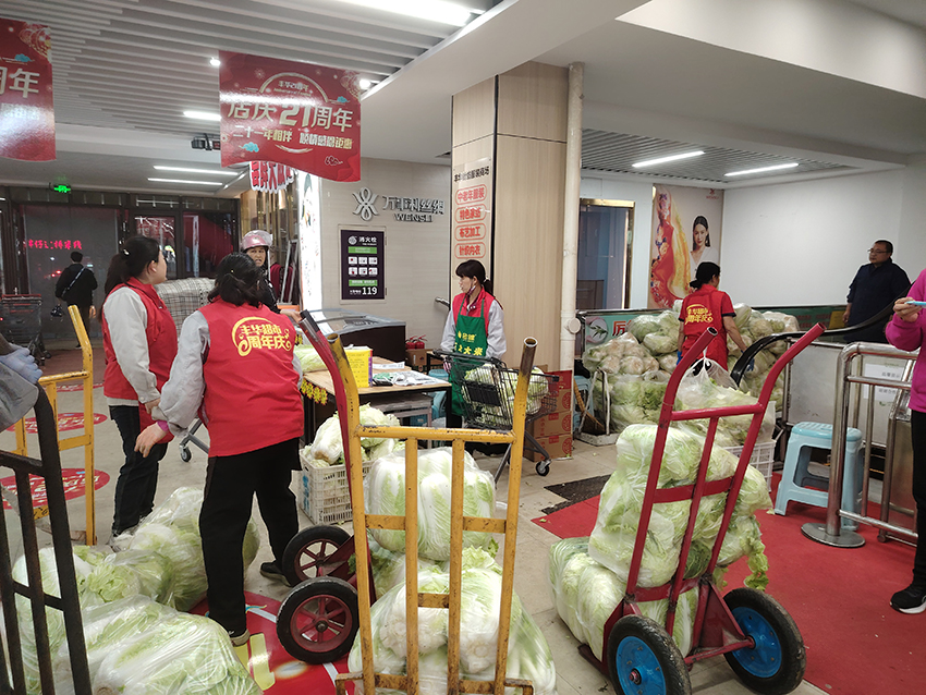 二十一周年慶期間,民生店同事們齊心協(xié)力,加班加點提前將店慶福利贈品大白菜擺放在兌獎處,以便顧客兌換領(lǐng)取。
