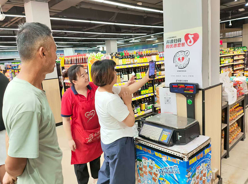民生店張慕華熱情幫助顧客操作抖音掃碼,以方便顧客實(shí)時(shí)了解門店線上活動(dòng)、購(gòu)買線上特價(jià)商品。